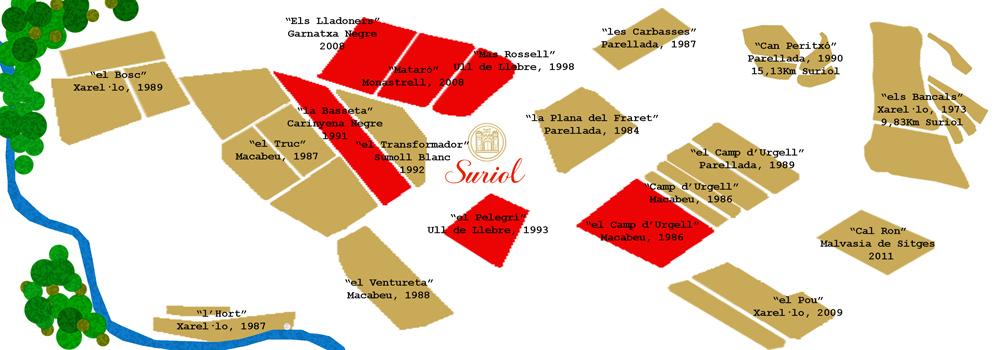 Per obtenir vins de qualitat la natura només ens deixa una opció: produir raïm de qualitat. A Cellers de Can Suriol elaborem tots els nostres vins al 100% amb raïms de les nostres vinyes certificades ecològiques des de l’any 1997 i amb un rendiment mitjà pròxim als 6.000Kg/Ha. En la actualitat conreem un total de 30Ha de vinya dividides en més de 25 microparcel·les totalment diferenciades que ens donen raïms amb multitud de matisos provinents del seu conreu. A més a més disposem de més de 3Ha d’Olivera arbequina i un ramat d’ovelles que pastura per les nostres vinyes comandat pel Quico, un bon amic de la família.